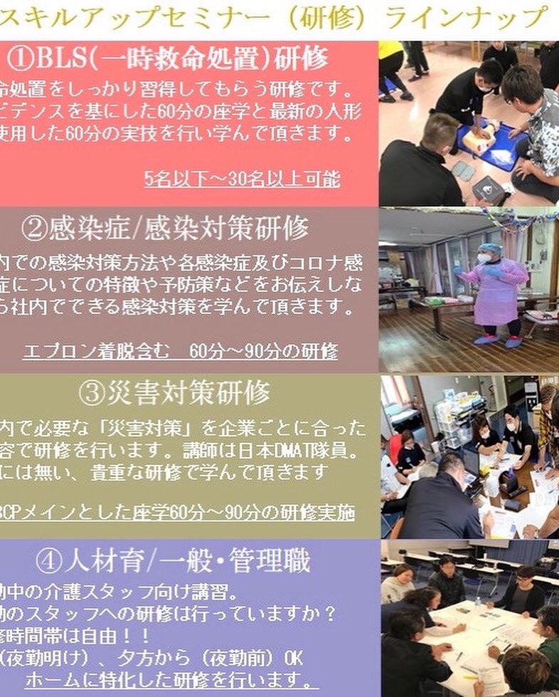 ホームに特化した、介護スタッフ向けの研修です。夜勤明け、夜勤後で研修時間帯が選べます。